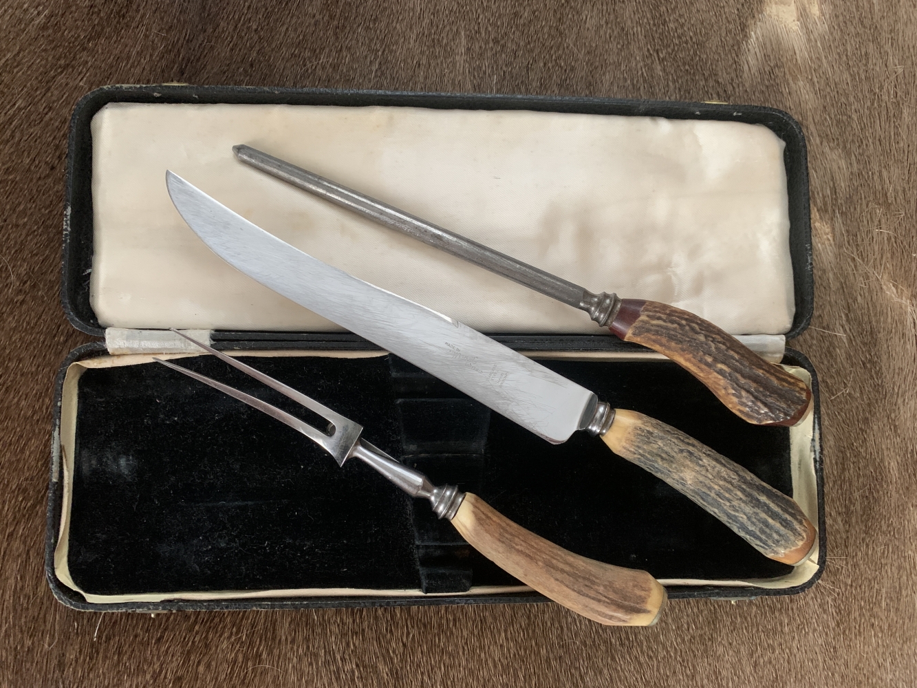 Box is in sound condition with a few wear marks and original lining and holds the Carving Knife, Meat Fork and Sharpening Steel.
