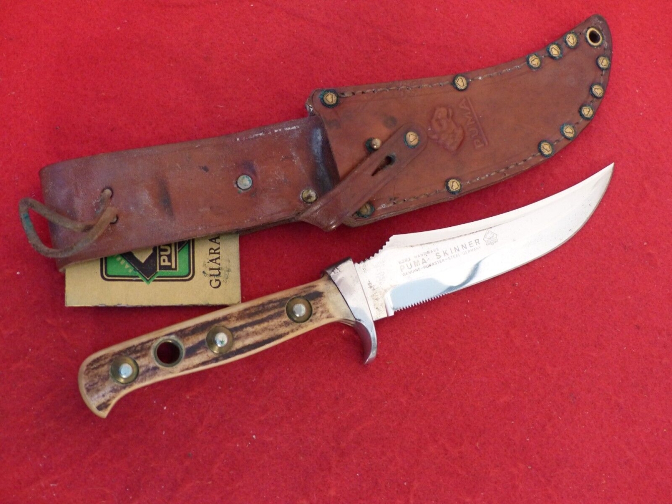 German PUMASTER steel blade. Full Tang. Polished Aluminum Finger Guard. Genuine Sambar Stag Handle. Comes with original brown leather belt sheath with Puma Emblem on front. Entire knife is Handmade in Germany and is very rare.