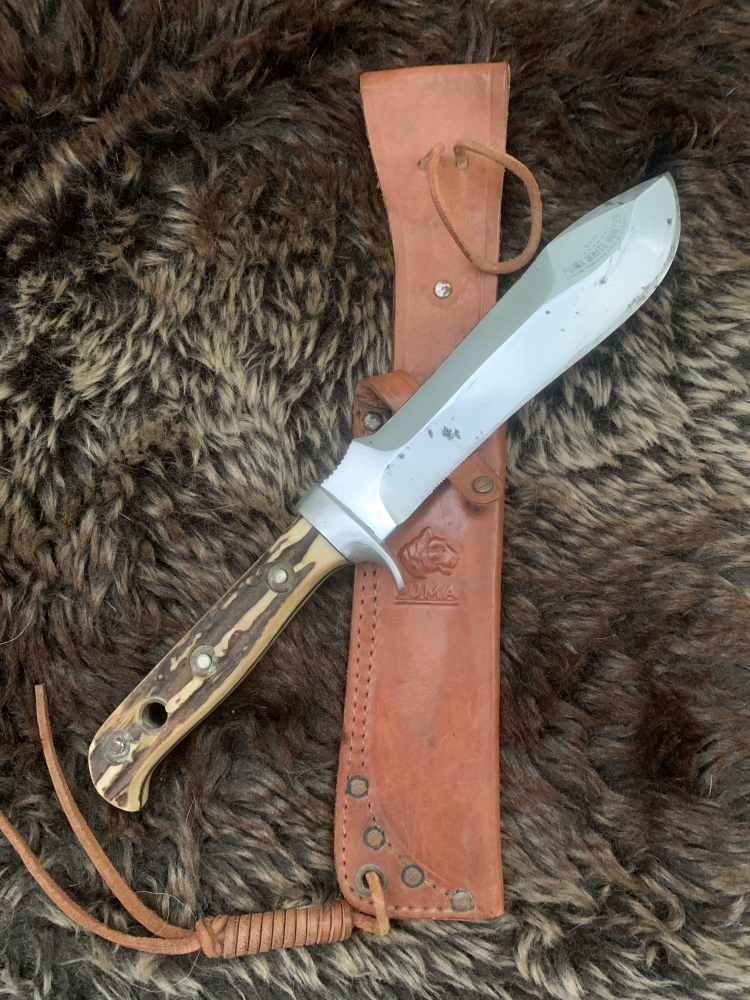Made from Pumaster Steel and stamped on the blade is: 6377 HANDMADE PUMA WHITE HUNTER GENUINE PUMASTER STEEL W-GERMANY
