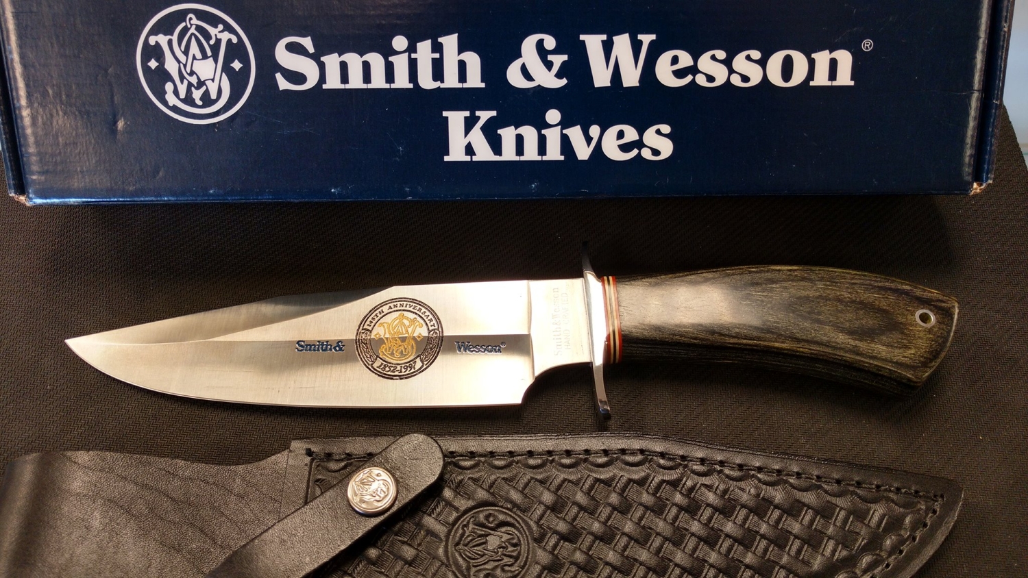 A rare collectable 1997 Hand Made Smith & Wesson USA Made 145th Anniversary Presentation Bowie Knife in Basket Weave Leather Sheath and Box.