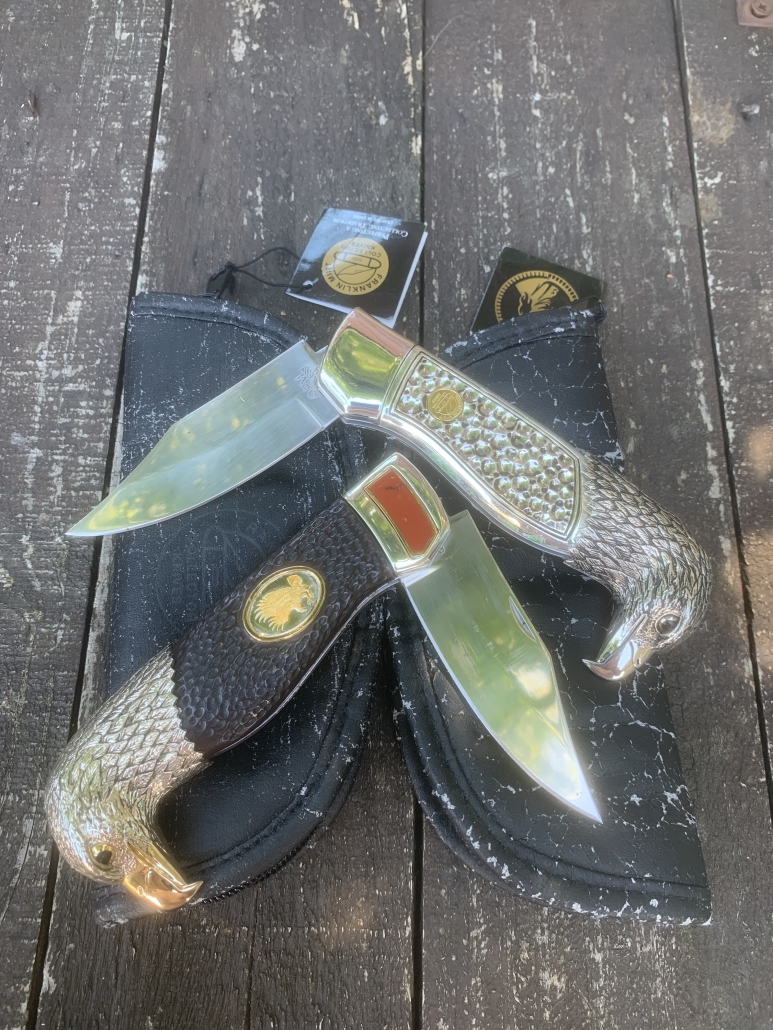 Made by FRANKLIN MINT and in unused condition, these are quite heavy EAGLE HEAD folding knives. Unused and in original pouches with tags (Pouches show a bit of age)