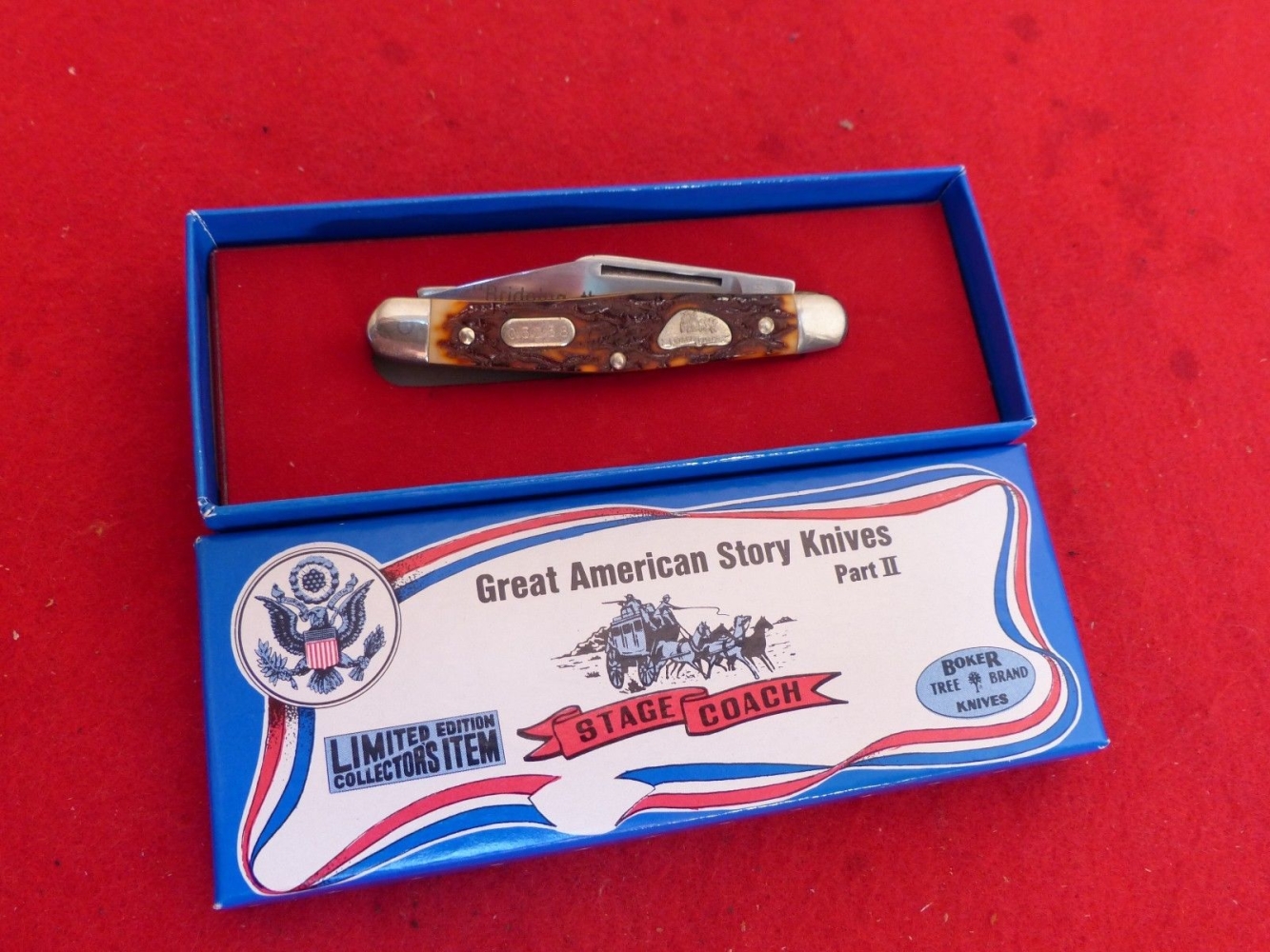 A very rare Boker USA made Tree Brand American Story II. 3-3/8″ Stage Coach 3 blade Stockman Knife