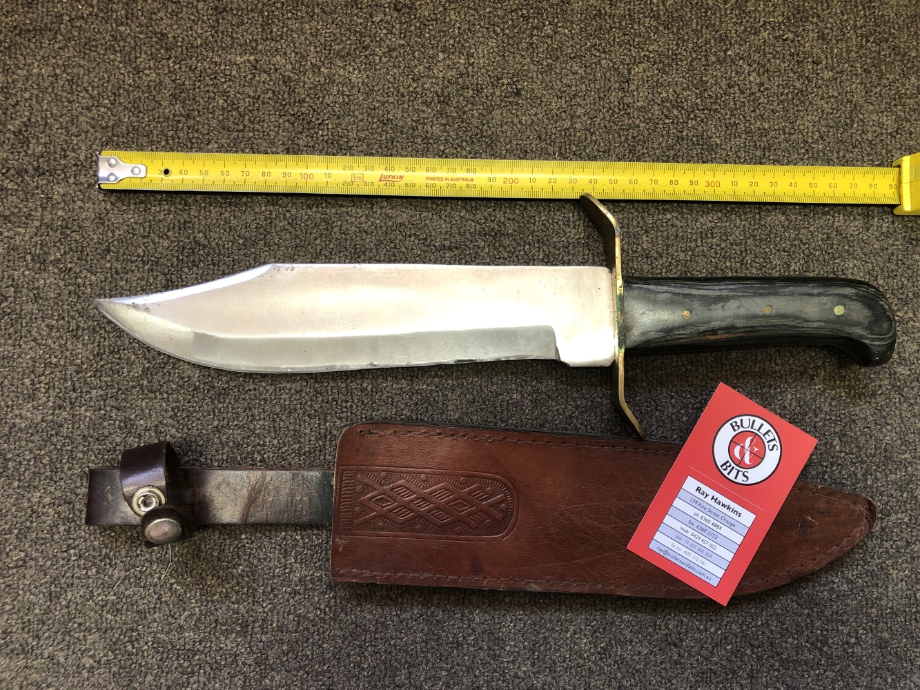 Used but good quality Big Bowie Knife with Pakkawood Handle, Brass Guard and leather Sheath.