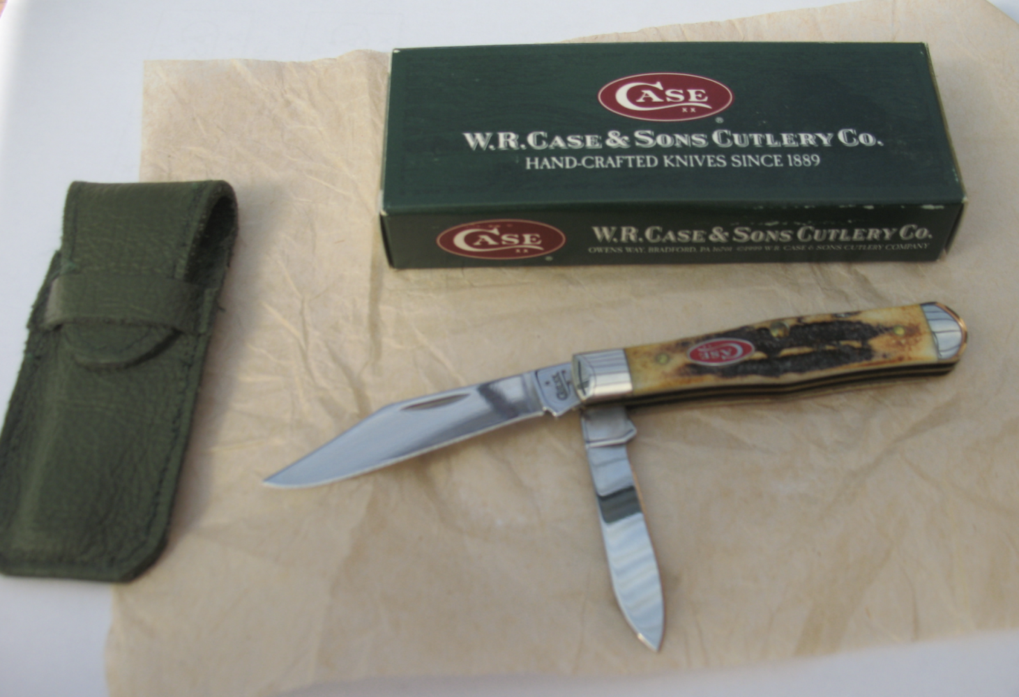 The knife is what Case describes as a “coke bottle” shape and has sambar antler scales, triple brass pinned.