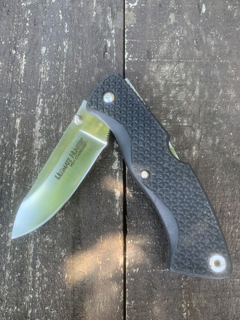Stamped on one side of the blade is: ULTIMATE HUNTER VG-1 STAINLESS and stamped on the other side is: COLD STEEL MADE IN JAPAN