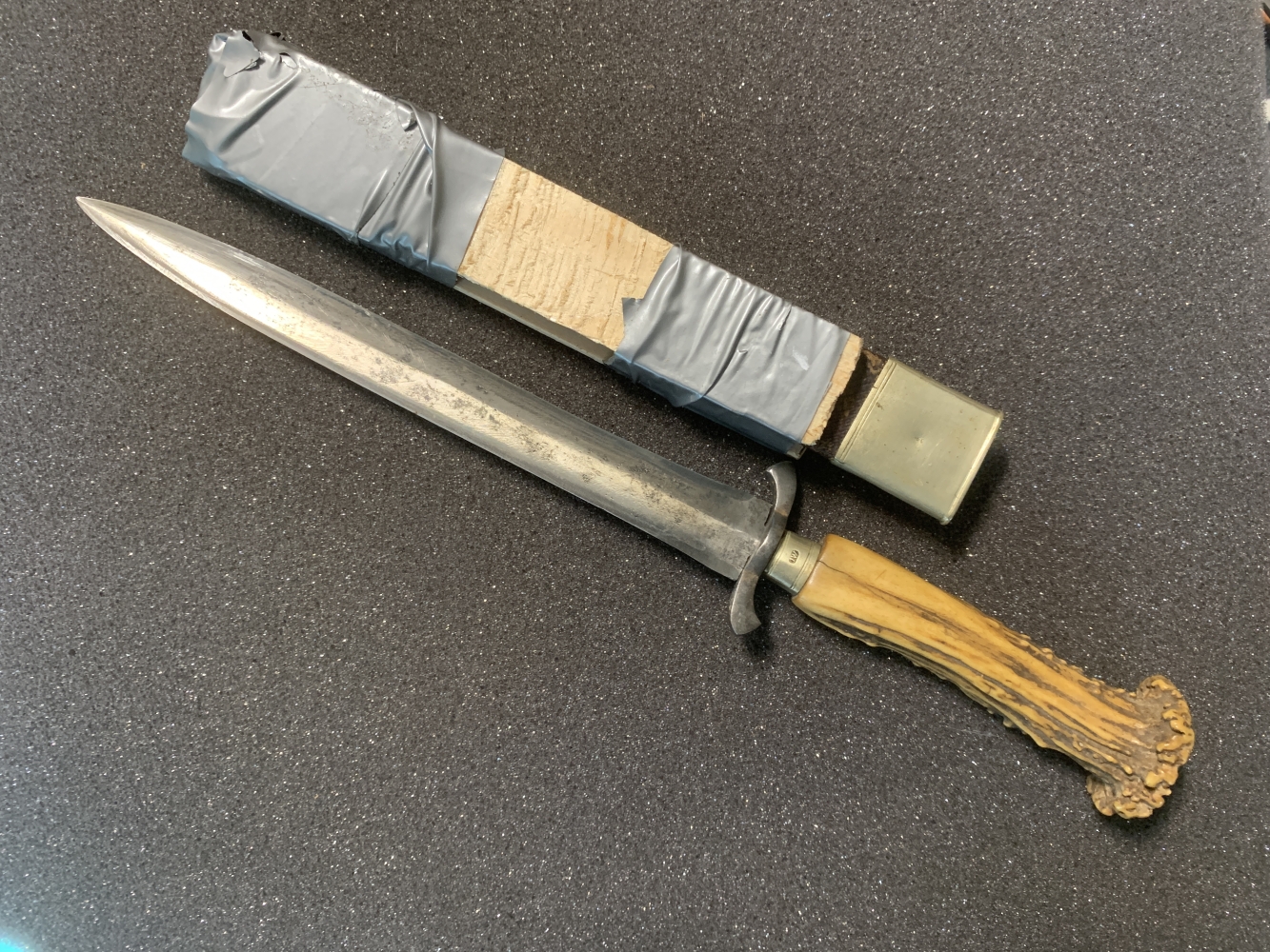 The leather Scabbard is in poor condition from age but could be restored and it still has the metal top part where the dagger is inserted. (Put in some slabs of taped wood for protection)