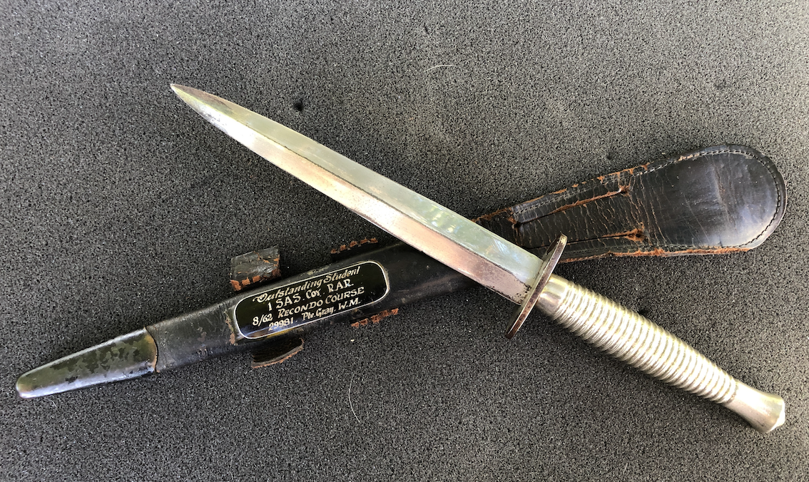 Early SASR Sheffield English made Commando Knife awarded to the best student on the selection on the August Recondo 1962 Carda.