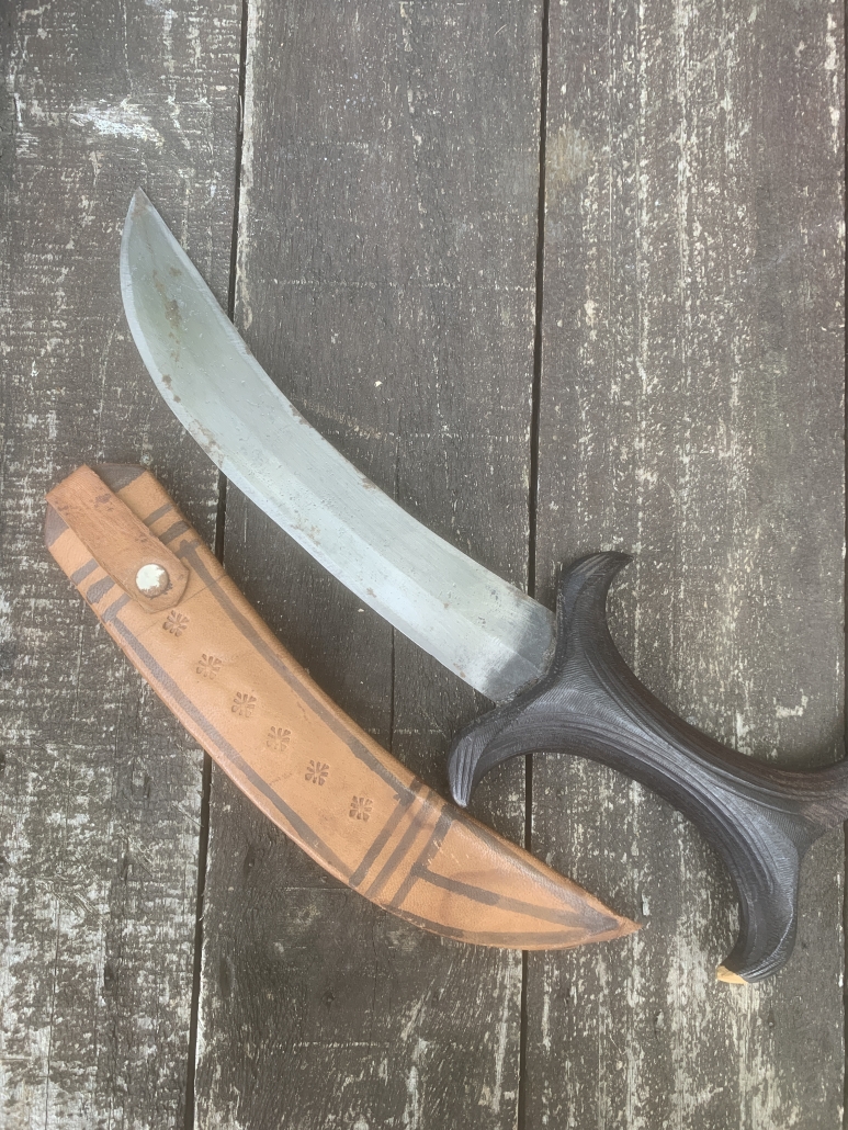This one is made from Carbon Steel and African Hard Wood Handle with a very nicely made Ornate & Shaped Leather Sheath